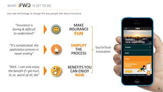 FWD Life Insurance Company launched an internal disruptor team called iFWD to change the way people feel about insurance using new technology and an agile development approach. iFWD quickly became the top direct and digital insurance distribution channel in Hong Kong by prototyping products rapidly based on online customer validation. iFWD disrupted consumer perception by ranking first in brand surveys and disrupted FWD's internal practices by digitalizing processes. They use precision marketing, innovative products like Savie savings insurance, partnerships, and work with regulators to push insurtech forward.