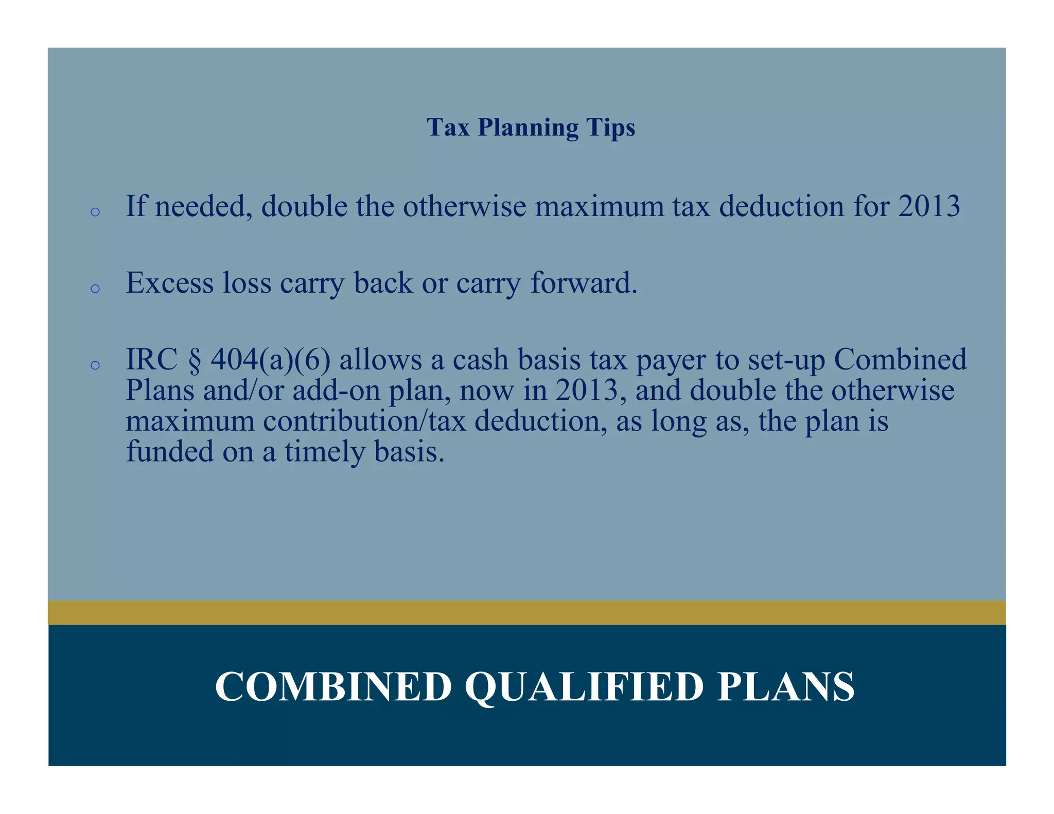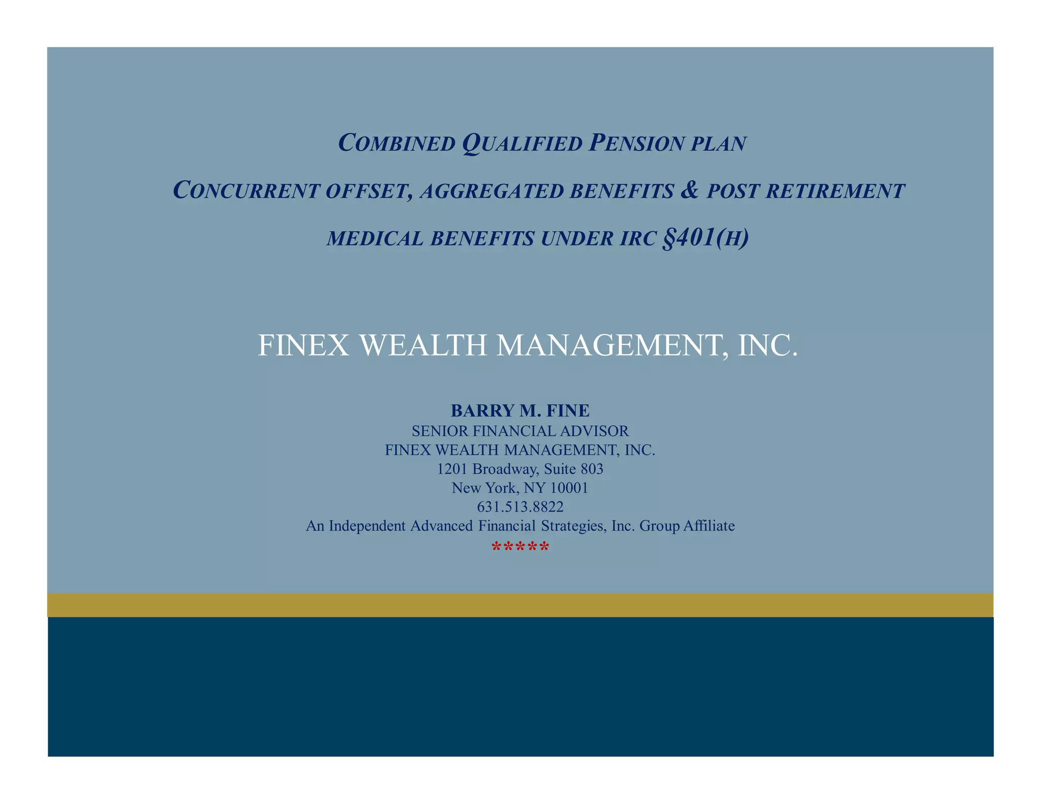 The document outlines the benefits and strategies of combined qualified pension plans and their tax advantages under IRC §401(h). It highlights key plan design rules, maximum contribution limits for various age groups, and the significance of ensuring non-discriminatory practices. Additionally, it emphasizes the role of Finex Wealth Management in providing comprehensive consulting and administrative services for plan sponsors.