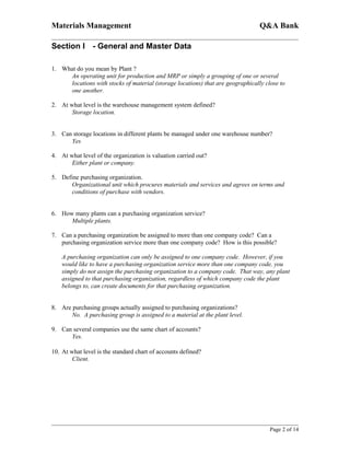 This document provides a question and answer bank on materials management topics organized into four sections: general master data, purchasing, inventory, and valuation and physical inventory. The questions cover topics such as organizational units, master data, purchasing documents, inventory transactions, and more. Definitions and explanations are provided for key terms and processes.
