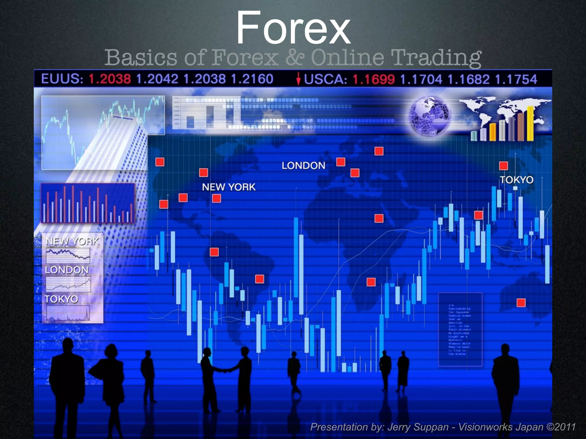 The document provides an overview of forex trading, including: