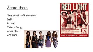 The music video for f(x)'s "Red Light" features various shots that build mystery and intrigue around the group. It begins with a ringing phone in a dark setting before revealing a silhouette of the group members behind a red light. Throughout the video, quick cuts between close-up and wide shots are used to highlight different members. Dark lighting and flashing red lights are also used to match the ominous tone and theme of overcoming societal restrictions. While the video follows conventions like synchronized dancing, it challenges expectations through its unconventional camera angles and members holding burning objects.
