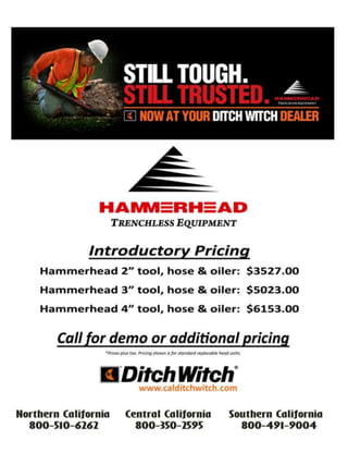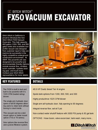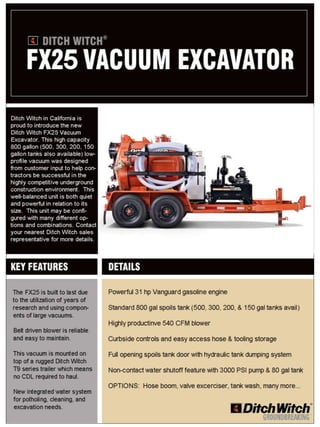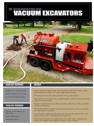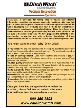 The document promotes Ditch Witch vacuum excavation systems for utilities and water departments. It highlights the technological and safety advancements of Ditch Witch products that can benefit agencies. Examples are provided of how Ditch Witch vacuums can efficiently excavate work spaces and complete jobs faster than traditional methods. Key advantages over competitors like its quieter operation and fully enclosed components are also outlined.