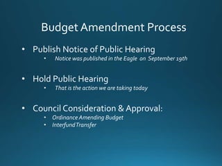 This document summarizes a public hearing on September 26, 2019 to consider Budget Amendment #3 for fiscal year 2019. The amendment includes $325,000 in additional funding for various departments and funds, including $40,000 for fleet maintenance, $25,000 for PEG fund, and $185,000 for employee medical claims. It also includes a $125,000 interfund transfer to correct allocation of TIRZ18 funds from debt service to capital improvement projects. If approved, the revised FY19 budget total would be $376,562,258.