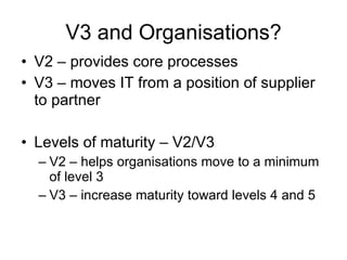 The document outlines the transition from a service provider to a strategic partner through service strategy, emphasizing the development of core processes to enhance organizational maturity. It discusses the principles and objectives of service strategy, including creating value and managing service offerings, utilizing strategic assets, and enhancing customer relationships. Key concepts include service packages, demand management, and financial management for quantifying the value of IT services and optimizing service delivery.