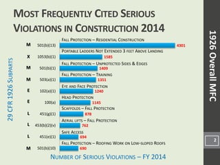 This document lists the most frequently cited serious OSHA violations in construction for fiscal year 2014. It provides the code of federal regulation for 25 different subparts, with the number of serious violations cited for each standard within those subparts. The most frequently violated standards included fall protection, scaffolding safety, excavation safety, electrical safety, and crane and rigging safety standards.