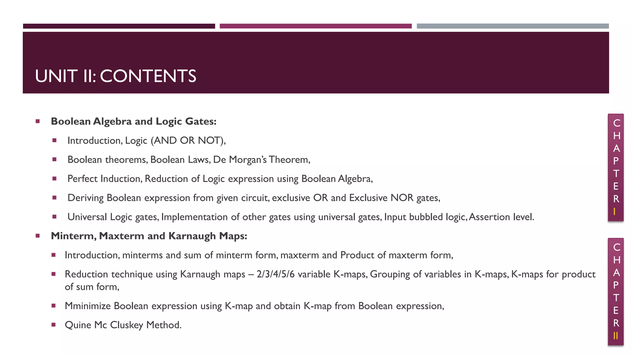 This document provides a comprehensive overview of Boolean algebra, logic gates, and simplification techniques such as minterms, maxterms, and Karnaugh maps in digital electronics. It covers the fundamentals of Boolean functions, canonical forms, and various methodologies for reducing Boolean expressions using graphical techniques. Additionally, it explains the application of Karnaugh maps for minimizing expressions of up to five variables, emphasizing techniques for achieving the simplest logical form.