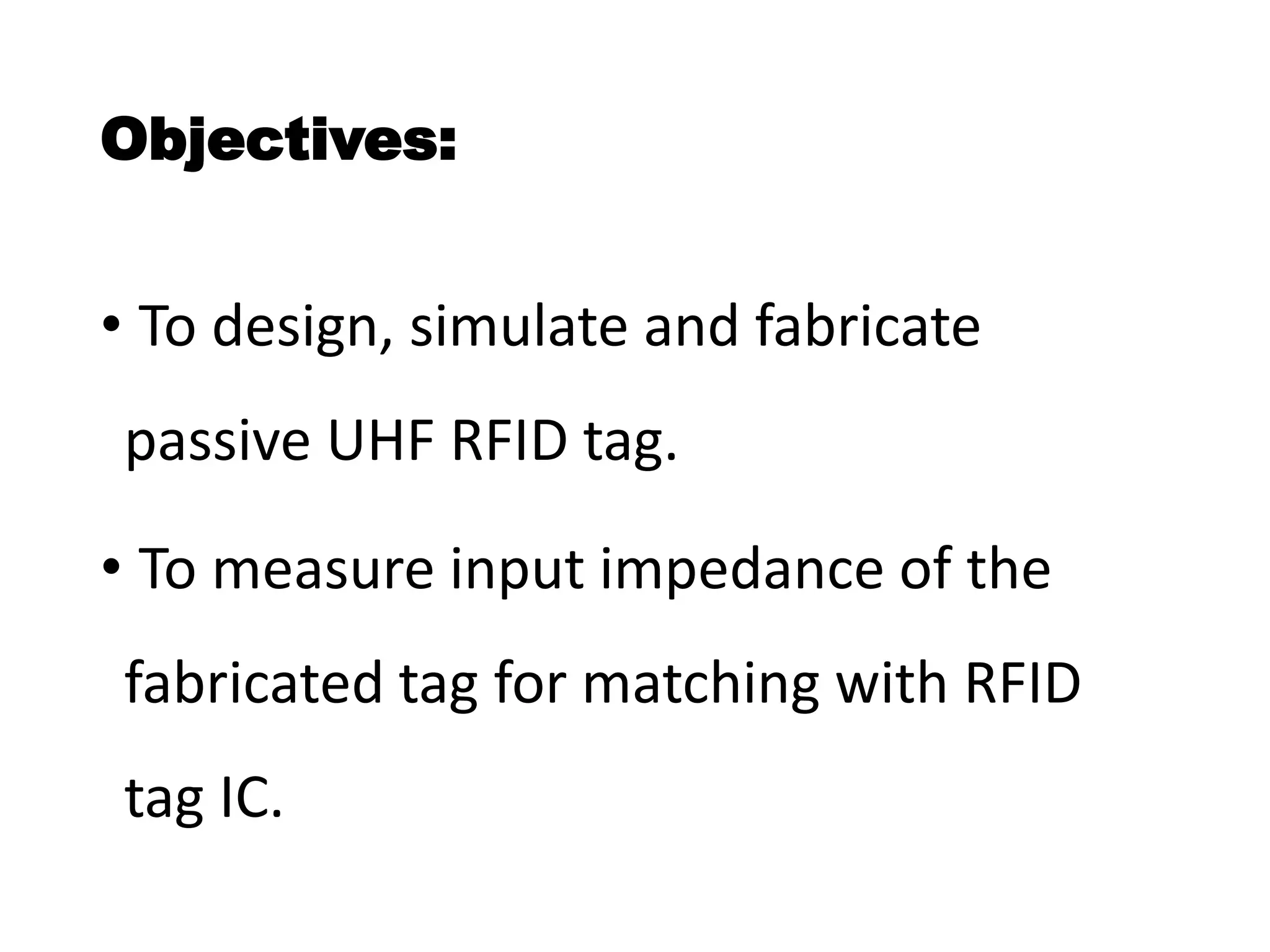 This document describes the design, simulation, and fabrication of a passive UHF RFID tag. The objectives are to design, simulate, and fabricate a passive UHF RFID tag and measure its input impedance. The project involves studying existing RFID tag designs, optimizing a design for implementation on an FR4 substrate, fabricating the tag, and measuring its input impedance. A proposed tag design is presented with reduced dimensions from an initial design. The tag is fabricated and its input impedance is measured. Additional measurements are taken after adding a microstrip balun to improve impedance matching.