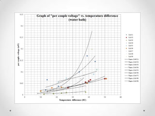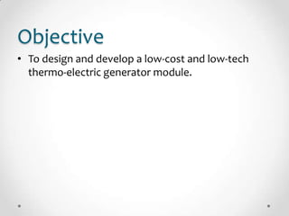 This document describes the design and development of a low-cost thermoelectric generator module that converts waste heat into electricity. The module uses the Seebeck effect to induce electricity from a temperature difference between aluminum and graphite strips. Several iterations were tested with improvements like clearer contact points between materials, more couples per slide to produce more power, and variations in strip widths and heights. Testing in an oil bath showed increased voltage output with greater temperature differences applied across the couples. The results demonstrate this simple module's potential as an efficient, renewable energy source from normally wasted heat.