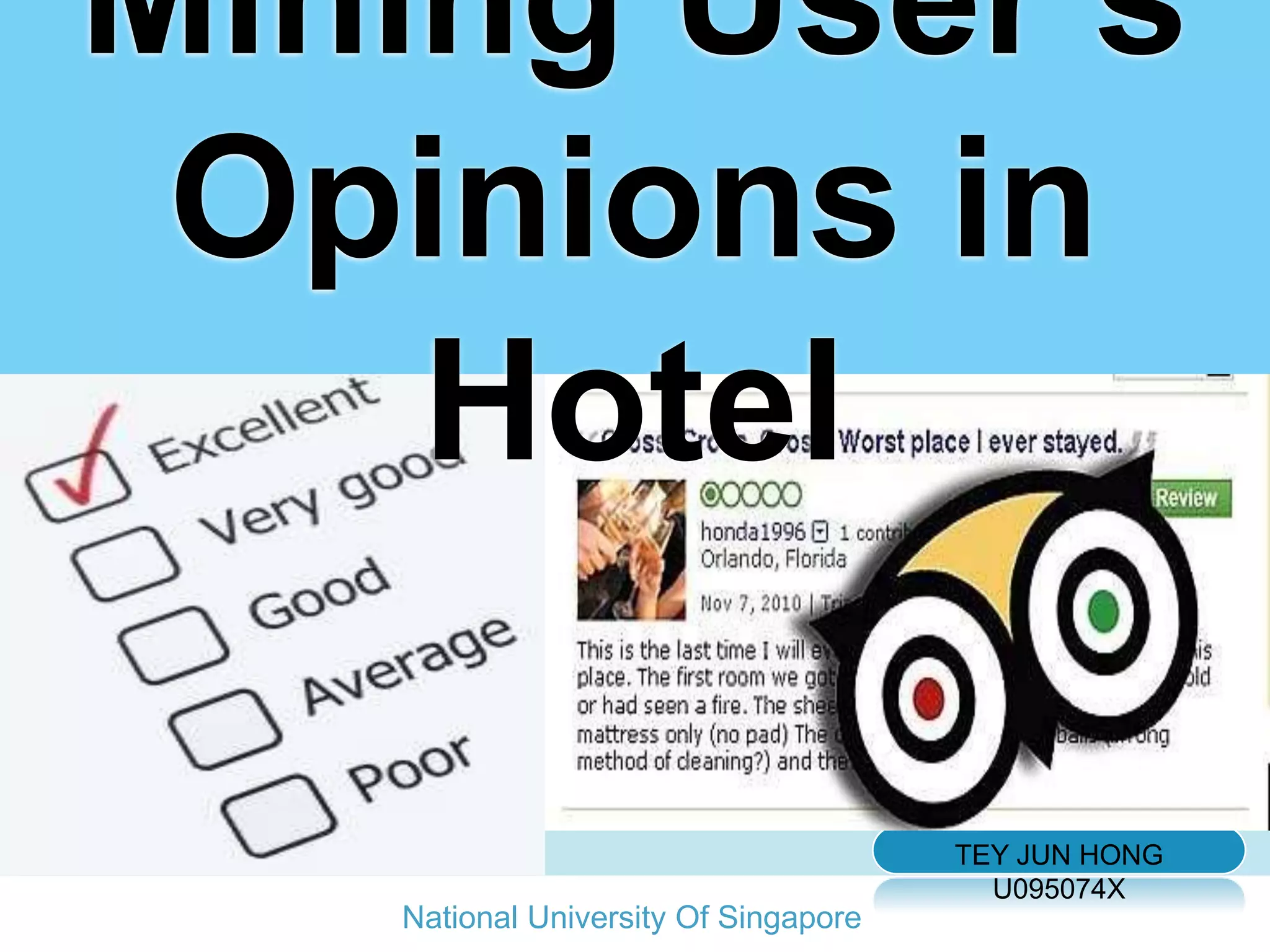 This document summarizes a student project on mining user opinions from hotel reviews. It discusses using data mining techniques like machine learning and sentiment analysis to analyze large amounts of online hotel review data and identify useful patterns. Specifically, it aims to predict review sentiment polarity, classify words by polarity in a sentiment lexicon, and detect relations between aspects and sentiments. The challenges include limitations of current sentiment lexicons and algorithms in capturing domain and context dependencies. The student proposes expanding existing lexicons using rule-based mining to help improve sentiment analysis accuracy.