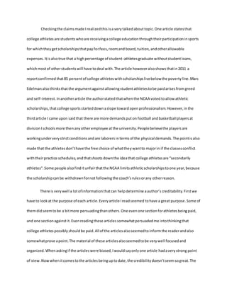 The document discusses the debate around paying college athletes. It notes that while colleges make millions from athletes' performances, athletes are given scholarships that cover education costs. However, some argue athletes are still living below the poverty line. It also discusses a recent ruling that Northwestern football players are university employees, which could allow players to unionize. There is no consensus on whether athletes are students or employees being exploited. The document examines different perspectives on the issue from several sources.