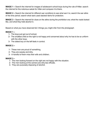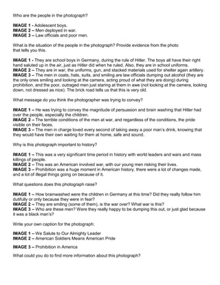 The document analyzes 3 historical photographs and summarizes key details about the people, situations, messages, and importance depicted in each image. For the first image of schoolboys in Germany under Hitler, it notes they are saluting like Hitler and in uniforms, showing Nazi indoctrination of youth. The second image of soldiers at war depicts the difficult conditions they faced but their visible pride. The third image shows law officials proudly dumping alcohol during Prohibition while poor men watch helplessly.