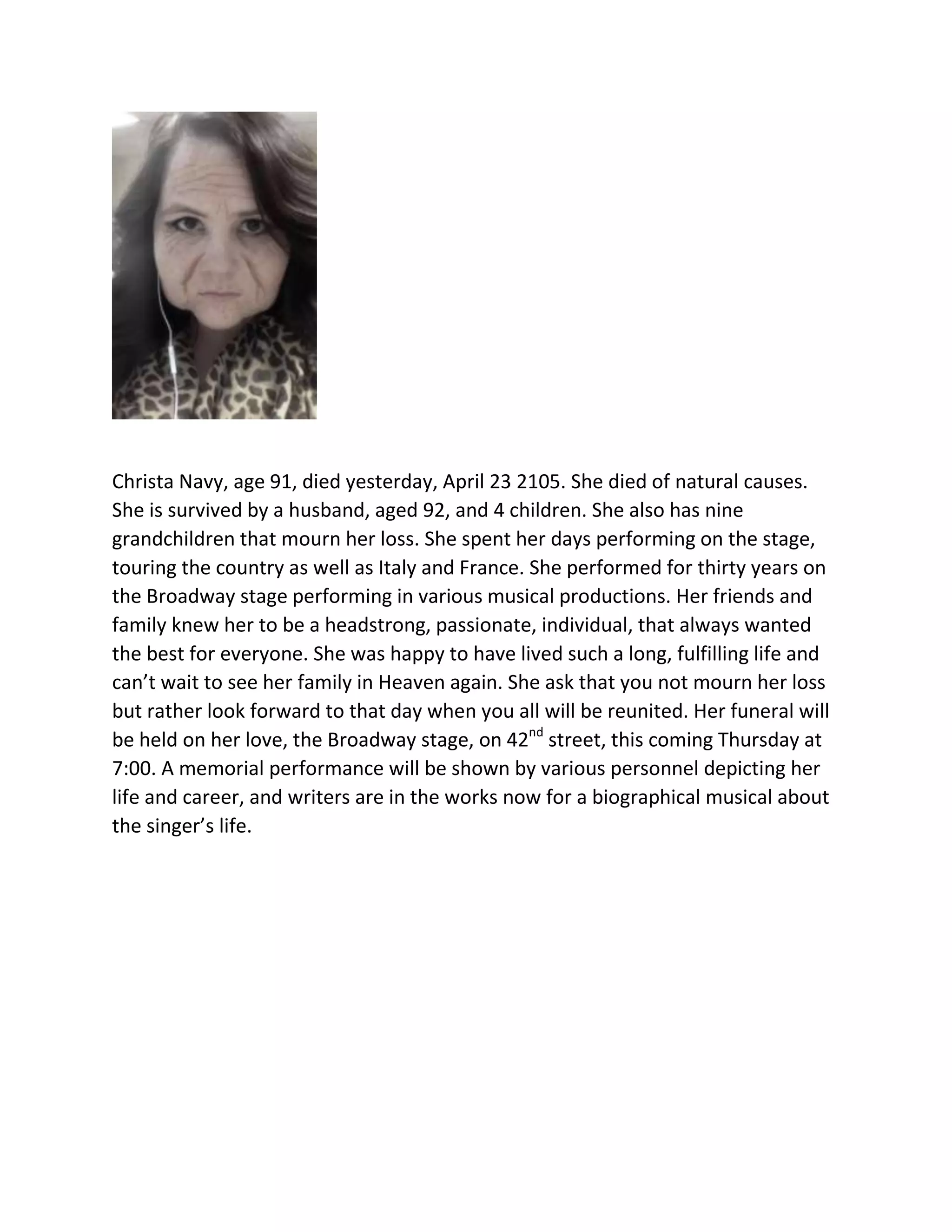 Christa Navy, a 91-year-old Broadway performer, died of natural causes on April 23, 2105, leaving behind a 92-year-old husband, four children, and nine grandchildren; she had spent 30 years performing on Broadway and touring Europe in various musical productions, and friends and family remember her as headstrong, passionate, and always wanting the best for others.