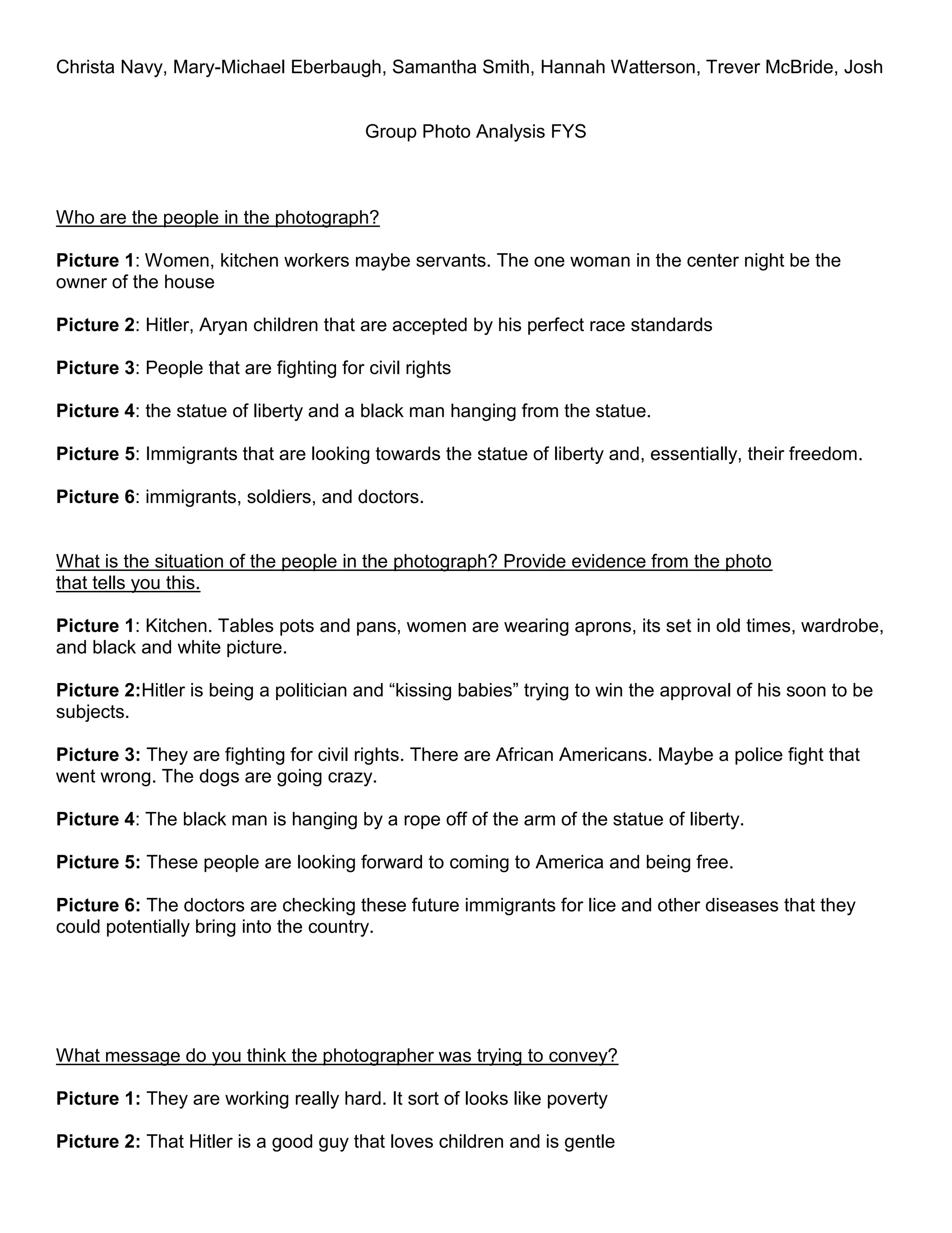 This document analyzes and summarizes 6 different historical photographs. For each photo, the document discusses who is in the photo, what the situation depicts, the message the photographer was trying to convey, why the photo is important historically, questions it raises, a proposed caption, and ways to find more context about the photo. The photos show scenes from different eras like women kitchen workers, Hitler with children, civil rights protests, immigration processing, and more.