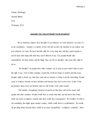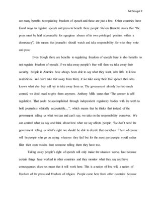 The document argues that journalist free speech should not be regulated by the government. It contends that America has long upheld freedom of speech and press as protected rights. While regulating speech could reduce offensive comments, it could also set a precedent for the government restricting other freedoms and citizens' ability to access information from a free press. Instead of government regulation, the document proposes that journalists practice self-regulation and consider how their speech might affect others.
