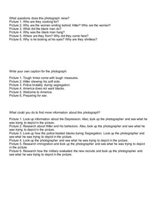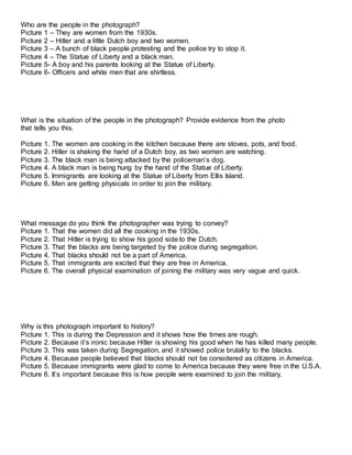 The document discusses 6 photographs and asks questions to analyze each one. Photograph 1 shows women cooking in the 1930s. Photograph 2 shows Hitler shaking a Dutch boy's hand. Photograph 3 depicts black protesters being attacked by police during segregation. Photograph 4 shows a black man being hung from the Statue of Liberty. Photograph 5 pictures immigrants viewing the Statue of Liberty at Ellis Island. Photograph 6 portrays military recruits receiving physical examinations.