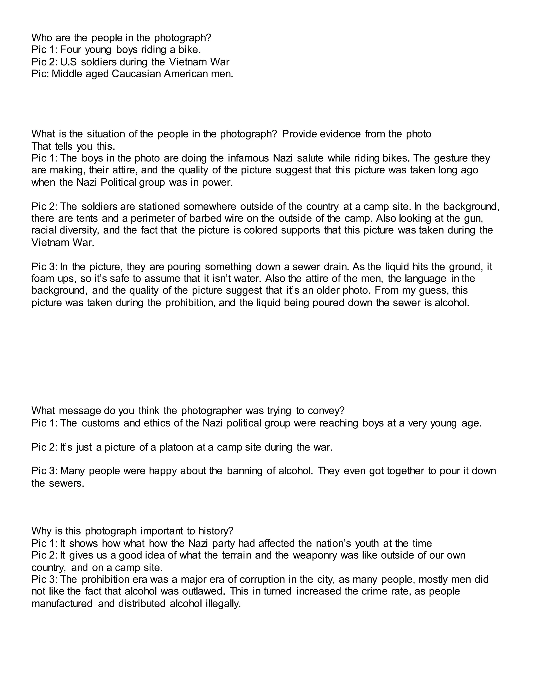 The document summarizes and analyzes three different photographs. For the first photo of boys on bikes, it infers that the photo was taken when the Nazi party was in power based on the boys making the Nazi salute. The second photo of US soldiers suggests it was taken during the Vietnam War based on the surroundings. The third photo of men pouring liquid down a drain is thought to be from Prohibition since the liquid foams, and the attire and language in the background point to an older photo.