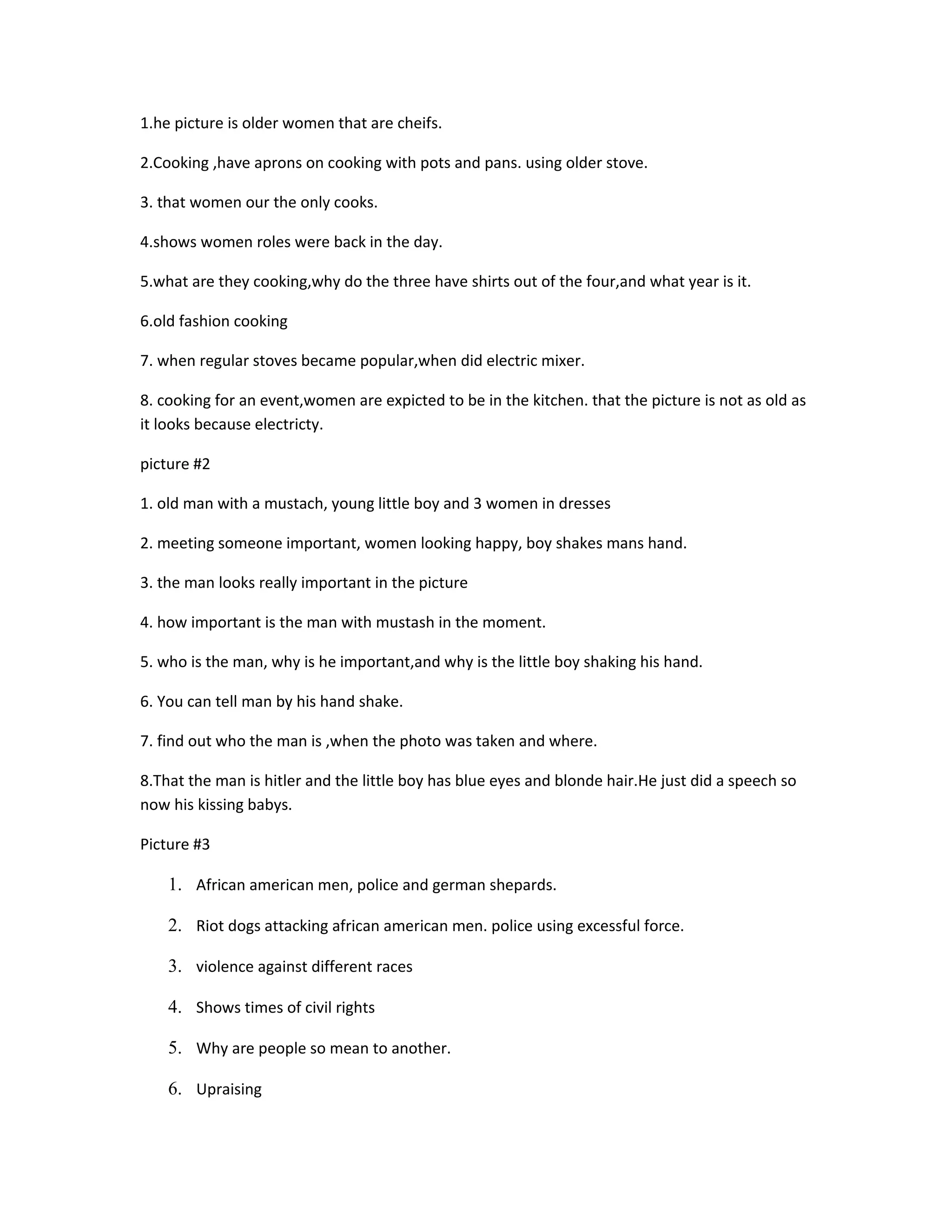 The document summarizes 6 different historical photographs through descriptions of their content and questions about context. The photographs depict: