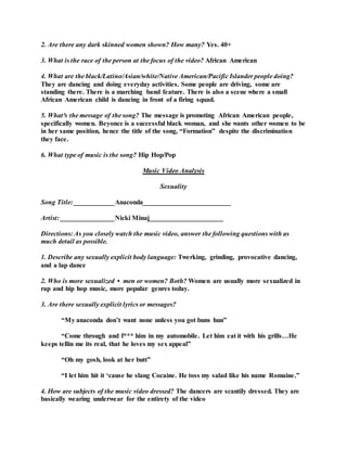 The document analyzes music videos based on their portrayal of gender roles, race, sexuality, materialism, and violence. It provides summaries of 6 different music videos, noting what each video depicts in these categories through its imagery, lyrics, and themes. Key details are extracted from questions answered about the videos and their messages.