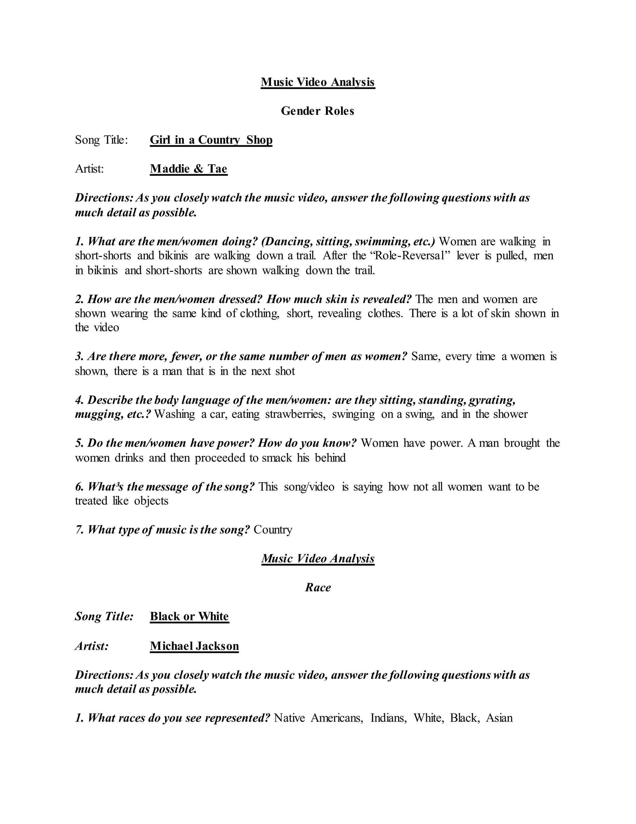 The document contains analyses of music videos based on themes of gender roles, race, sexuality, materialism, and violence. For each video, the author describes the representations and messaging related to the given theme. They analyze depictions of men and women, various races, sexual or suggestive content, material goods, and violent imagery or lyrics. The overall purpose is to closely examine how these social issues are portrayed in popular music videos.