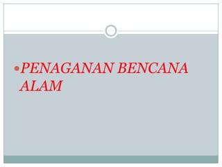Dokumen tersebut membahas tentang penanganan bencana alam di Indonesia. Secara garis besar membahas tentang jenis-jenis bencana alam yang sering terjadi seperti gempa bumi, tsunami, dan tanah longsor beserta cara antisipasi dan penanganannya. Dokumen ini juga menjelaskan langkah-langkah mitigasi bencana yang dapat dilakukan baik secara preventif, saat terjadi bencana, maupun pasca bencana.