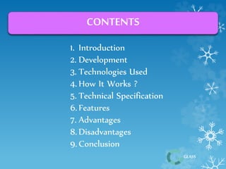 The document discusses Google Glass, a wearable computer developed by Google that features an optical head-mounted display for hands-free access to information and internet interaction through voice commands. It outlines its development, technologies used, how it operates, and includes details on its specifications, features, advantages, and disadvantages. Google Glass aims to combine augmented and virtual reality for an immersive user experience while highlighting both its potential benefits and concerns regarding safety and privacy.