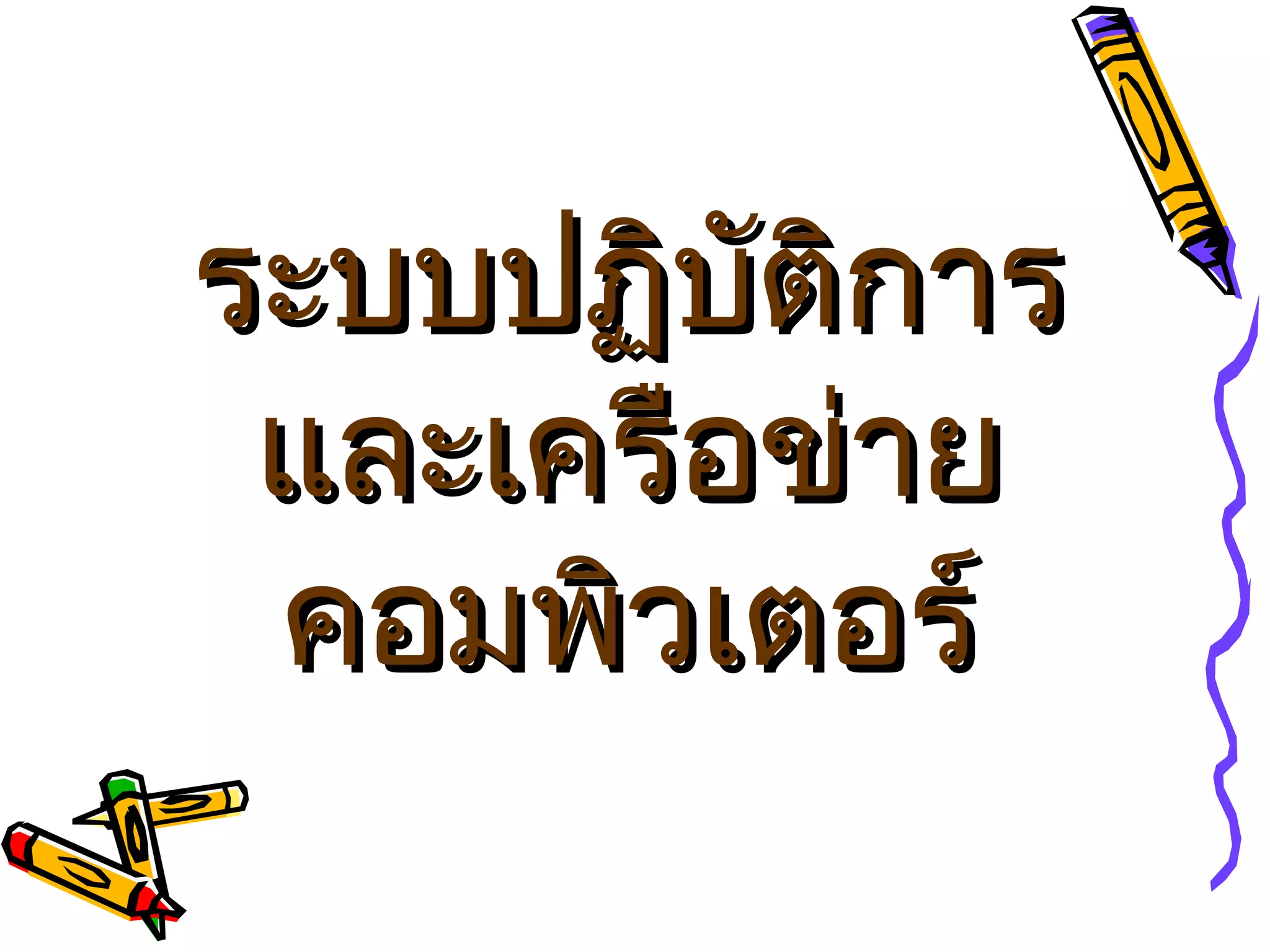 ระบบปฏิบัติการ ระบบปฏิบัติการ หรือที่เรียกย่อๆ ว่า โอเอส ( Operating System : OS) เป็นซอฟต์แวร์ใช้ในการดูแลระบบคอมพิวเตอร์ เครื่องคอมพิวเตอร์ทุกเครื่องจะต้องมีซอฟต์แวร์ระบบปฏิบัติการนี้ ระบบปฏิบัติการที่นิยมใช้กันมากและเป็นที่รู้จักกันดีเช่นดอส ( Disk Operating System : DOS) วินโดวส์ ( Windows) โอเอสทู ( OS/2) ยูนิกซ์ ( UNIX DOS เป็นซอฟต์แวร์จัดระบบงานที่พัฒนามานานแล้ว การใช้งานจึงใช้คำสั่งเป็นตัวอักษร ดอสเป็นซอฟต์แวร์ที่รู้จักกันดีในหมู่ผู้ใช้ไมโครคอมพิวเตอร์ Windows ระบบปฏิบัติการที่พัฒนาต่อจากดอส เพื่อเน้นการใช้งานที่ง่ายขึ้น สามารถทำงานหลายงานพร้อมกันได้ ทำให้ใช้งานคอมพิวเตอร์ได้ง่าย วินโดวส์จึงได้รับความนิยมในปัจจุบัน OS/2 เป็นระบบปฏิบัติการแบบเดียวกับวินโดวส์