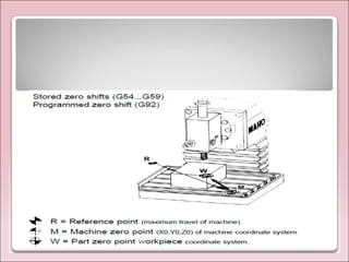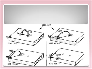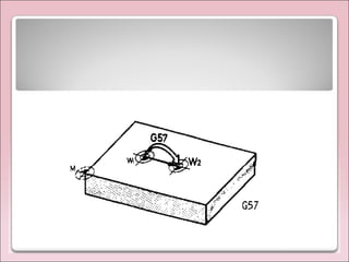 The document discusses G & M codes used in computer numerical control (CNC) and computer-aided manufacturing (CAM). It provides descriptions of common G codes for linear and circular interpolation, drilling cycles, tool compensation, and measurement units. It also describes frequently used M codes for spindle control, stopping, cooling, and mirroring. Examples of G and M code usage in part programs are provided.