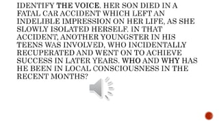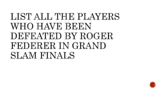 The document describes the various rounds and events of a quiz competition finals. It includes 6 rounds of questions on various topics: Femme Fatale, Shortlisted, Mixed Bag (clockwise and anti-clockwise rounds with 24 questions each), Photo Memory, LVC, and Written rounds. Scoring details are provided for some rounds. A minimalistic approach is suggested focusing on 6 posters and the written round list of 11 tennis players. Clockwise and anti-clockwise question rounds have similar formats with instructions for pouncing and bouncing for points.