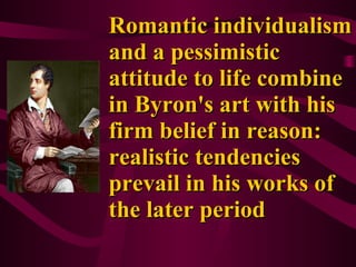 George Gordon Byron was a Romantic poet known for his works reflecting individualism and pessimism. He was influenced by experiences in Scotland where he admired the natural scenery. His writing was also influenced by an ideal woman he knew named Mary Chaworth. Byron published several famous works including "Hours of Idleness", "English Bards and Scotch Reviewers", and "Childe Harold's Pilgrimage". Later in his career, he spent time in Italy where he was influenced by revolutionary political ideas and wrote works like "Don Juan", his longest satirical poem.