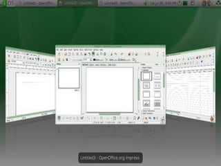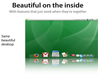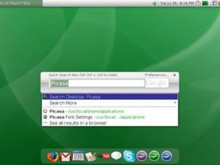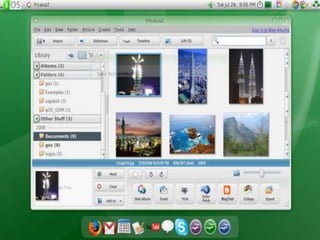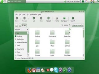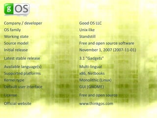 gOS is an Ubuntu-based Linux distribution created by Good OS LLC to make accessing web 2.0 applications like Google apps easy for mainstream users. The first version was based on Ubuntu 7.10 and featured the Enlightenment window manager. It has gone through several releases that added more Google apps and functionality. It has low system requirements and includes features like Google gadgets, Picasa, Mail, Calendar, Documents and 3D window switching.