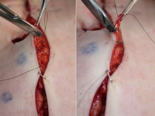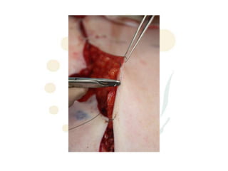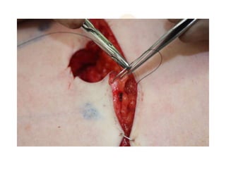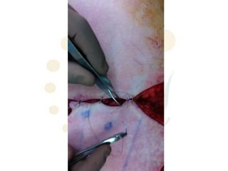 The document provides guidance on suturing techniques. It recommends everting the skin edges when suturing to achieve better dermal apposition, improved healing, and a finer scar. A triangular suture passage with the base located deeply is suggested to evert the wound edges, while an inverted triangular shape tends to invert them. Dermal sutures are recommended first to reduce tension before cutaneous sutures. Adjusting where the knot lies can help flatten steps between uneven wound edges. The document also reviews appropriate suture materials for different areas, recommending absorbable sutures that elicit minimal tissue reaction for the face and longer-absorbing sutures for prone areas like the back.