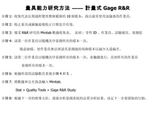 步驟 1: 收集代表長期過程變異整個範圍的 10 個樣本,找出最常使用該儀器的作業員。 步驟 2: 校正量具或檢驗最後校正日期是否有效。 步驟 3: 備妥 R&R 研究的 Minitab 數據收集表。 表頭 : 零件 ID 、作業員、試驗號次、量測值 步驟 4: 請第一位作業員以隨機次序量測所有的樣本一次。 隨意抽樣,使作業員無法辨認其量測過的每個樣本以減少人爲偏差。 步驟 5: 請第二位作業員以隨機次序量測所有的樣本一次,並繼續進行,直到所有的作業員 量測所有的樣本一次。 步驟 6: 根據所需的試驗數次重複步驟 4 和 5 。 步驟 7: 將數據和公差資訊輸入 Minitab. Stat > Quality Tools > Gage R&R Study 步驟 8: 根據下一頁的指導方針,透過分析量測系統的品質分析結果,決定下一步要採取的行動。 量具能力研究方法 —— 計量式 Gage R&R - 2.