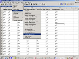 步驟 1—— 從過程中至少選擇30 個零件。 – 這些零件中 50% 應當有缺點 – 這些零件的 50% 應當沒有缺點 – 如果可能,選擇好與不好邊界線附近的樣本 步驟 2—— 鑑定合格的檢驗員。 步驟 3—— 讓每個檢驗員獨立地按隨機次序檢驗這些零件,並決定它們是否合格。 步驟 4—— 將數據登錄於運算表,以便報告計數量測系統的效力。 步驟 5—— 記錄結果。如有必要,採取適當行動將檢驗過程修正。 步驟 6—— 重新進行研究,驗證修正案後的檢驗過程是否正確。 註 : 用 30 個個體的樣本即可對檢驗員的效率和能力作出估計,其不確定性可在合理的情況,一般來說不需要較大的樣本,因爲過大的樣本明顯會降低檢驗過程的效率。 方法 —— Attribute Gage R&R - 10.