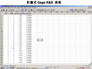 Two-Way ANOVA TableWith Interaction Source DF SS MS F P PartID 9 0.468373 0.0520415 89.6480 0.00000 OperName 2 0.013476 0.0067379 11.6069 0.00058 OperName*PartID 18 0.010449 0.0005805 2.4703 0.01380 Repeatability 30 0.007050 0.0002350 Total 59 0.499348 Gage R&R %Contribution Source VarComp (of VarComp) Total Gage R&R 7.16E-04 7.70 Repeatability 2.35E-04 2.53 Reproducibility 4.81E-04 5.17 OperName 3.08E-04 3.31 OperName*PartID 1.73E-04 1.86 Part-To-Part 8.58E-03 92.30 Total Variation 9.29E-03 100.00 StdDev Study Var %Study Var Source (SD) (5.15*SD) (%SV) Total Gage R&R 2.68E-02 0.137769 27.75 Repeatability 1.53E-02 0.078948 15.90 Reproducibility 2.19E-02 0.112904 22.74 OperName 1.75E-02 0.090363 18.20 OperName*PartID 1.31E-02 0.067690 13.63 Part-To-Part 9.26E-02 0.476948 96.07 Total Variation 9.64E-02 0.496446 100.00 須小于 9%. 須小于 30%. - 7.