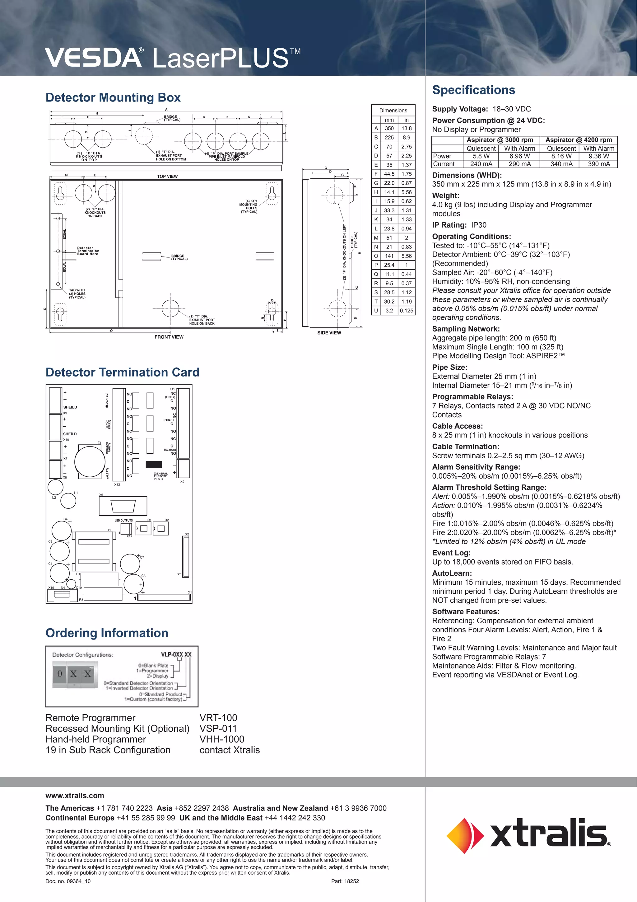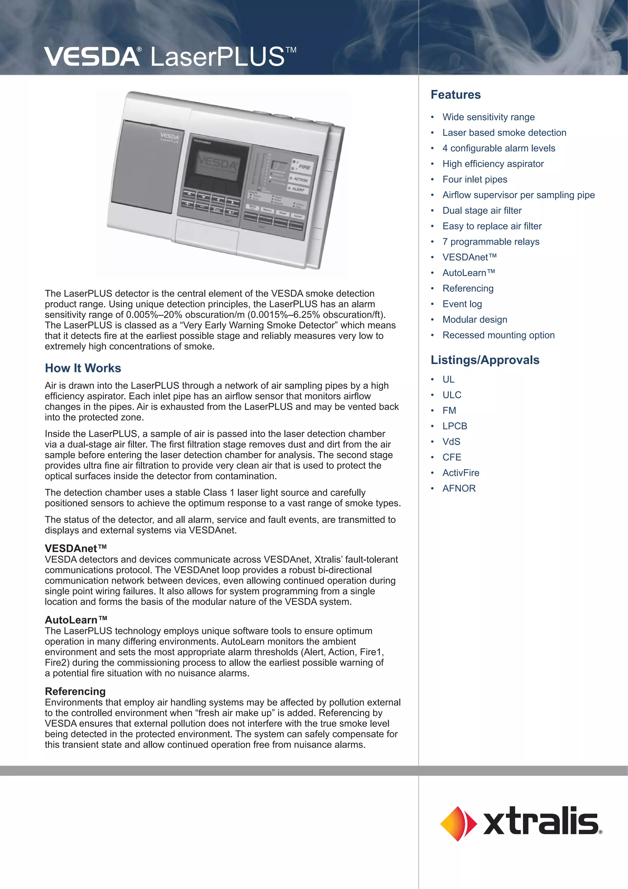 The LaserPLUS detector uses laser-based smoke detection to detect fires at an early stage. It has an alarm sensitivity range of 0.005-20% obscuration per meter and uses a dual-stage air filter and laser detection chamber to analyze air samples for smoke. The detector communicates using VESDAnet and can automatically set alarm thresholds using AutoLearn during commissioning.