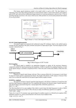 This document analyzes speech coding algorithms for Hindi and English languages. It discusses Linear Predictive Coding (LPC), an algorithm that accurately estimates speech parameters and represents speech signals at reduced bit rates while preserving quality. The paper proposes a voice-excited LPC algorithm and implements it on Hindi and English male and female voices. It analyzes tradeoffs between bit rates, delay, signal-to-noise ratio, and complexity. The results show low bit-rates and better signal-to-noise ratio with this algorithm.