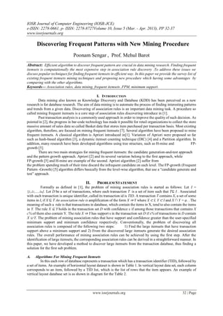 This document provides a summary of existing algorithms for discovering frequent patterns in transactional datasets. It begins with an introduction to the problem of mining frequent itemsets and association rules. It then describes the Apriori algorithm, which is a seminal and classical level-wise algorithm for mining frequent itemsets. The document notes some limitations of Apriori when applied to large datasets, including increased computational cost due to many database scans and large candidate sets. It then briefly describes the FP-Growth algorithm as an alternative pattern growth approach. The remainder of the document focuses on improvements made to Apriori, including the Direct Hashing and Pruning (DHP) algorithm, which aims to reduce the candidate set size to improve efficiency.