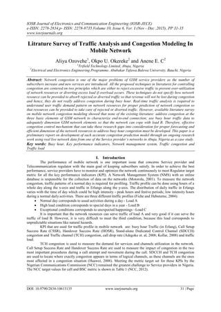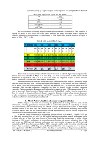 This document summarizes previous literature on traffic analysis and congestion modeling in mobile networks. It reviews works that have evaluated network performance at different elements like the BTS, BSC and MSC. However, none addressed congestion at all three basic elements (BTS, BSC, MSC) to characterize end-to-end connections, or used busy hour traffic data to adequately dimension network elements. The document also identifies gaps in the existing research, such as not establishing the statistical causes of congestion or using sufficient data. It proposes to analyze traffic at the access and core networks using live network data over two years to help dimension elements and identify congestion causes to develop an accurate congestion prediction model.