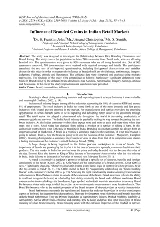 This study investigates the impact of branding dimensions on rice brand ratings among 780 consumers in Tamil Nadu, India. The results indicate statistically significant influences from branding factors such as salience, performance, imagery, feelings, attitude, and resonance on brand ratings. The findings highlight the growing importance of branding in the Indian retail rice market, suggesting that effective branding strategies are crucial for satisfying consumer expectations.