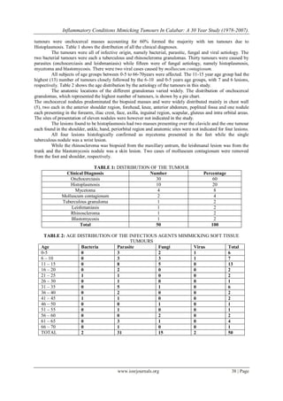 This study reviewed 50 inflammatory soft tissue lesions surgically removed and diagnosed histologically over a 30-year period from 1978-2007 at the University of Calabar Teaching Hospital in Nigeria. Onchocerciasis accounted for 60% of the lesions, followed by histoplasmosis at 20%. Other identified conditions included mycetoma, molluscum contagiosum, tuberculosis, leishmaniasis, rhinoscleroma, and blastomycosis. The lesions presented most commonly in children and young adults aged 5-15 years. Onchocercal nodules were widely distributed but predominantly in the chest wall. Histoplasmosis lesions were found in the clavicle, shoulder, ankle,