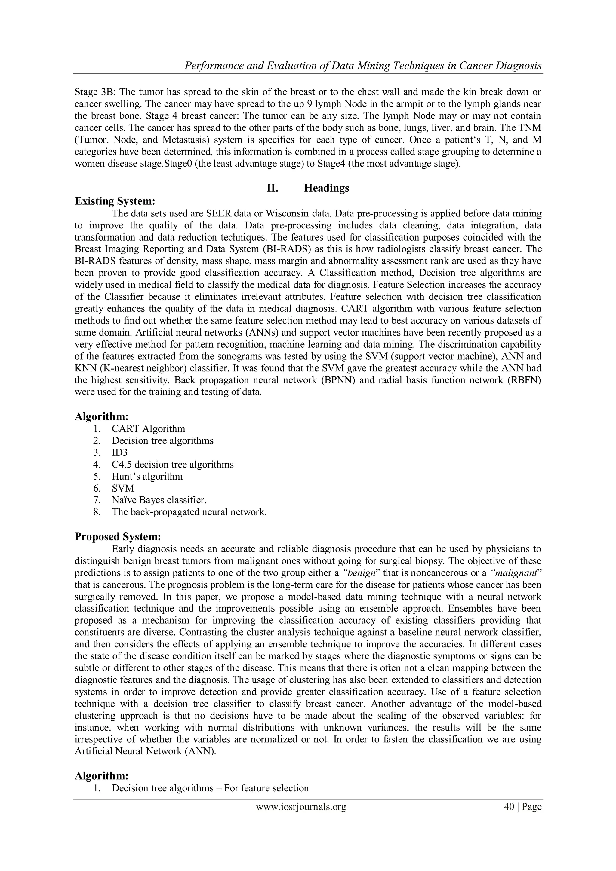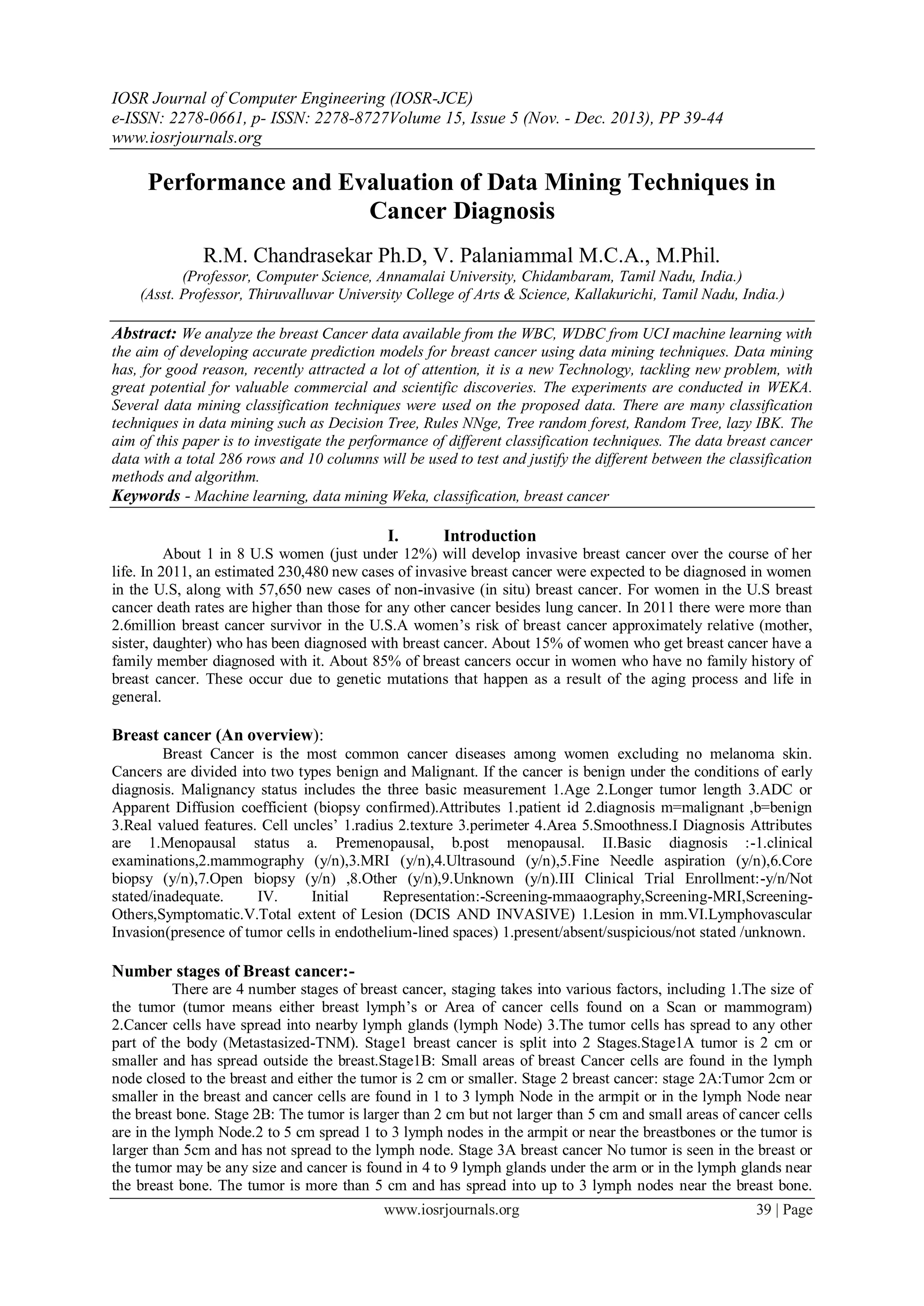 The document analyzes breast cancer diagnosis using various data mining techniques, focusing on developing accurate prediction models from datasets like the Wisconsin Breast Cancer dataset. It evaluates several classification methods, including decision trees and artificial neural networks, highlighting their performance in distinguishing malignant from benign tumors. Overall, the study emphasizes the effectiveness of ensemble and advanced classification techniques in improving diagnostic accuracy for breast cancer.