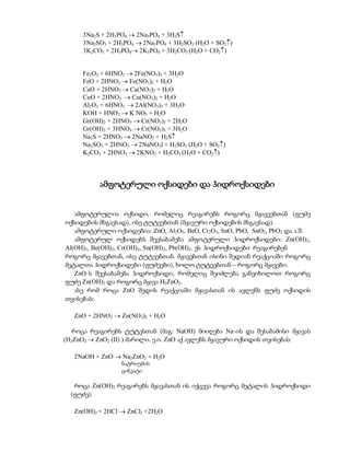 2Na3PO4 + 3H2S 3Na2SO3 + 2H3PO4 2Na3PO4 + 3H2SO3 (H2O + SO2) 3K2CO3 + 2H3PO4 2K3PO4 + 3H2CO3 (H2O + CO2) Fe2O3 + 6HNO3 2Fe(NO3)3 + 3H2O FeO + 2HNO3 Fe(NO3)2 + H2O CaO + 2HNO3 Ca(NO3)2 + H2O CuO + 2HNO3 Cu(NO3)2 + H2O Al2O3 + 6HNO3 2Al(NO3)3 + 3H2O KOH + HNO3 K NO3 + H2O Gr(OH)2 + 2HNO3 Cr(NO3)2 + 2H2O Gr(OH)3 + 3HNO3 Cr(NO3)3 + 3H2O Na2S + 2HNO3 2NaNO3 + H2S Na2SO3 + 2HNO3 2NaNO3l + H2SO3 (H2O + SO2) K2CO3 + 2HNO3 2KNO3 + H2CO3 (H2O + CO2) ამფოტერული ოქსიდები და ჰიდროქსიდები ამფოტერულია ოქსიდი, რომელიც რეაგირებს როგორც მჟავეებთან (ფუძე ოქსიდების მსგავსად), ისე ტუტეებთან (მჟავური ოქსიდების მსგავსად). ამფოტერული ოქსიდებია: ZnO, Al2O3, BeO, Cr2O3, SnO, PbO, SnO2, PbO2 და ა.შ. ამფოტერულ ოქსიდებს შეესაბამება ამფოტერული ჰიდროქსიდები: Zn(OH)2, Al(OH)3, Be(OH)2, Cr(OH)3, Sn(OH)2, Pb(OH)2. ეს ჰიდროქსიდები რეაგირებენ როგორც მჟავებთან, ისე ტუტეებთან. მჟავებთან ისინი შედიან რეაქციაში როგორც მეტალთა ჰიდროქსიდები (ფუძეები), ხოლო ტუტეებთან – როგორც მჟავები. ZnO-ს შეესაბამება ჰიდროქსიდი, რომელიც შეიძლება განვიხილოთ როგორც ფუძე Zn(OH)2 და როგორც მჟავა H2ZnO2. ასე რომ როცა ZnO შედის რეაქციაში მჟავასთან ის ავლენს ფუძე ოქსიდის თვისებას: ZnO + 2HNO3 Zn(NO3)2 + H2O როცა რეაგირებს ტუტესთან (მაგ: NaOH) მიიღება Na-ის და შესაბამისი მჟავას (H2ZnO2 ZnO2 (II) ) მარილი. ე.ი. ZnO აქ ავლენს მჟავური ოქსიდის თვისებას: 2NaOH + ZnO Na2ZnO2 + H2O ნატრიუმის ცინკატი როცა Zn(OH)2 რეაგირებს მჟავასთან ის იქცევა როგორც მეტალის ჰიდროქსიდი (ფუძე): Zn(OH)2 + 2HCl ZnCl2 +2H2O