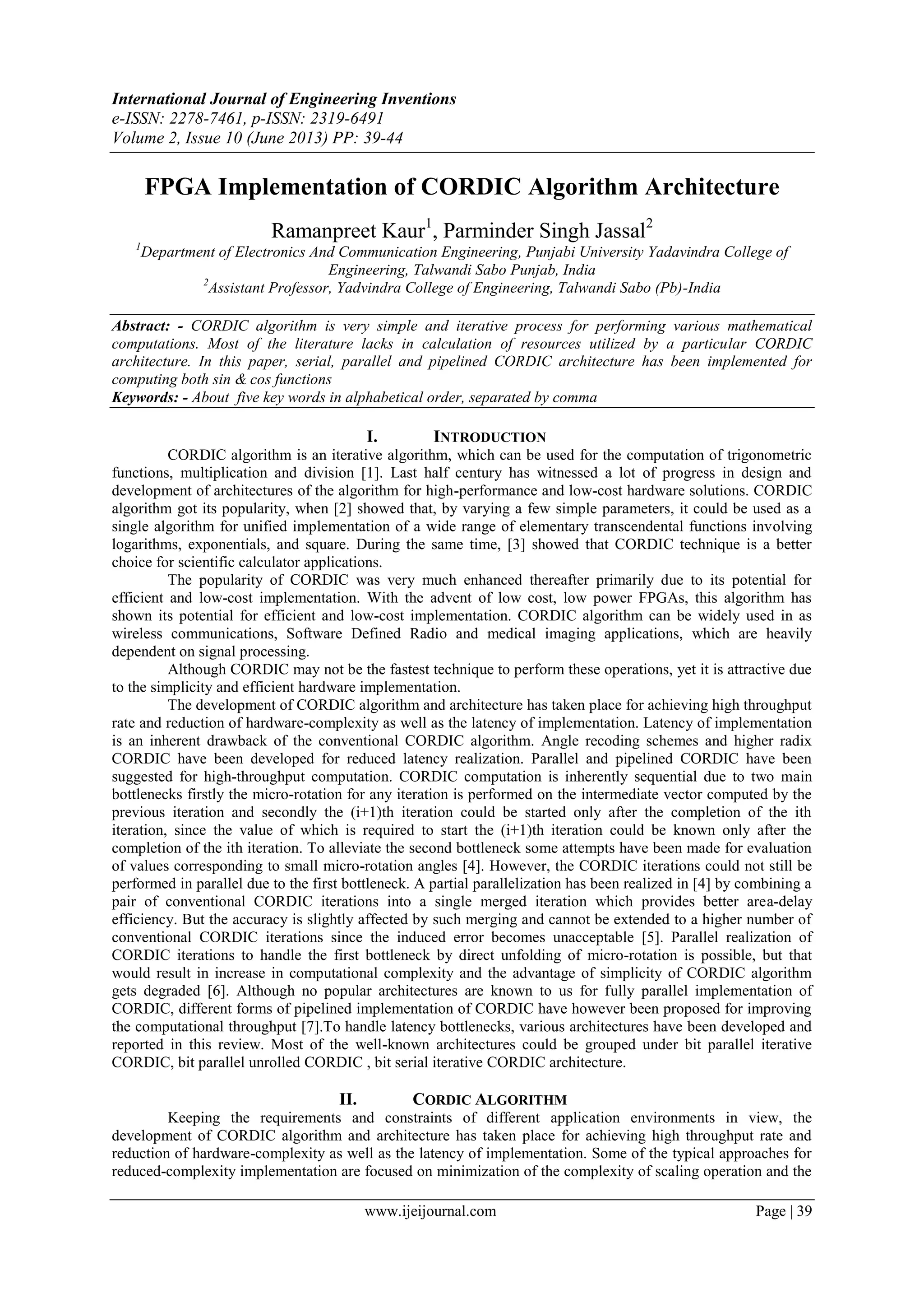 The document discusses the FPGA implementation of the CORDIC algorithm architecture for computing sine and cosine functions. It details various architectures such as serial, parallel, and pipelined implementations, emphasizing the advantages and resource utilizations of each. The findings indicate that while parallel architectures have higher resource requirements, they significantly improve computational throughput compared to serial architectures.