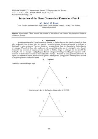 This document describes the invention of new formulas for finding the height and area of a triangle using Pythagorean theorem. The author derives two formulas for calculating the height of a triangle based on the lengths of the three sides. The height formulas are then used to derive two new formulas for calculating the area of a triangle when all three side lengths are known. The author provides detailed steps and examples to demonstrate how to apply the new height and area formulas to solve problems involving finding heights and areas of triangles.