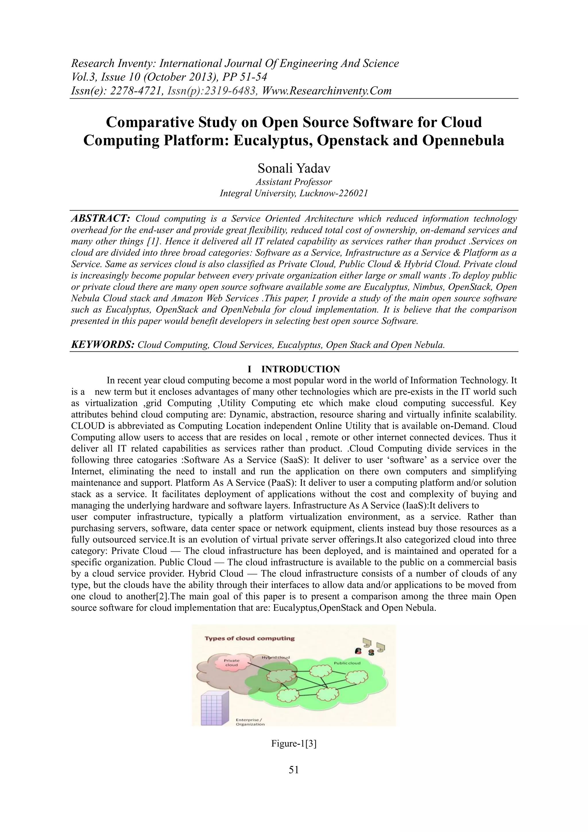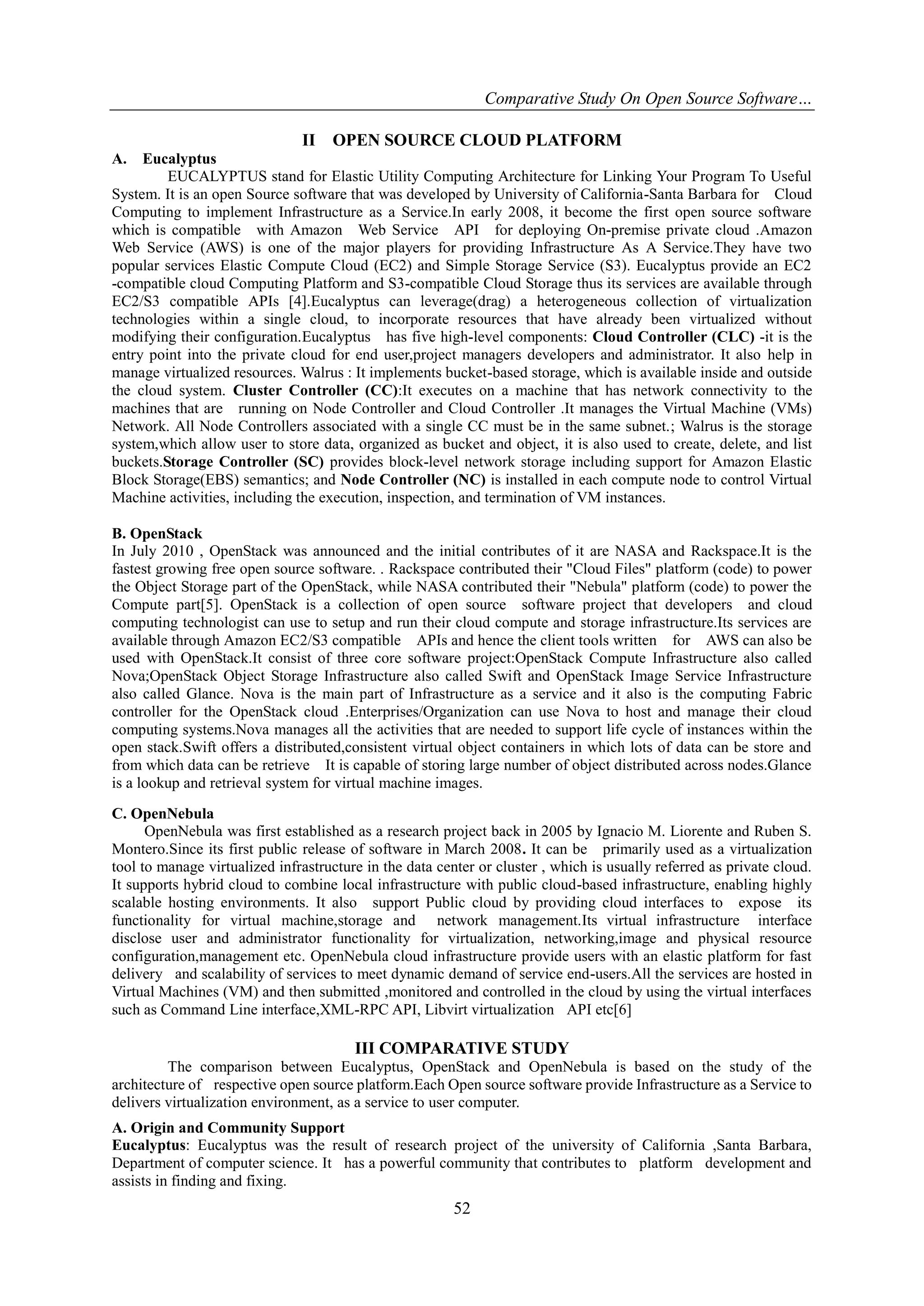 The document presents a comparative study of three open source cloud computing platforms: Eucalyptus, OpenStack, and OpenNebula, highlighting their features, architectures, and community support. It discusses the evolution of cloud computing, differentiating between various service categories and types of clouds, before delving into specific platform capabilities and compatibility with Amazon Web Services. The findings aim to assist developers in choosing the most suitable software for cloud implementation based on their needs.