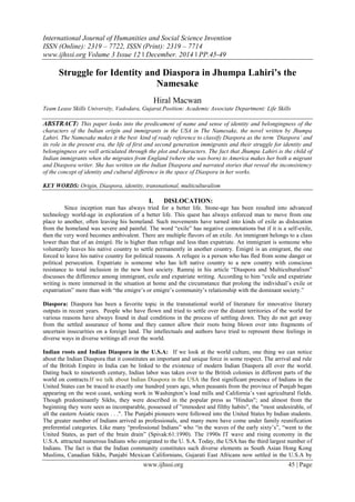 The document examines the themes of identity and belonging in Jhumpa Lahiri's novel 'The Namesake,' highlighting the struggles faced by Indian immigrants in the USA. It discusses the complexities of diasporic experience, including cultural dislocation, the significance of names, and the multifaceted nature of identity as characters grapple with their heritage. Ultimately, the text emphasizes the ongoing quest for self-definition amidst the tensions between two cultures.