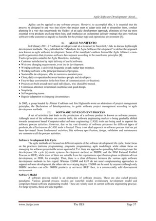 The document discusses the evolution of agile software development methods, tracing their origins back to lightweight approaches introduced in the mid-1990s as alternatives to traditional heavyweight methodologies. It highlights the Agile Manifesto published in 2001, outlining key principles that promote iterative, collaborative, and adaptive planning, as well as various agile practices and processes that support software development. The paper also explores the suitability and challenges of agile methodologies in different development environments, emphasizing that these methods may be inefficient in larger organizations or specific project types.