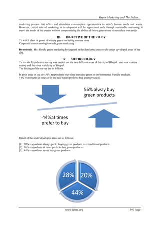 This research paper investigates the factors influencing Indian consumers' intentions to buy environmentally friendly products, highlighting differences in purchasing power between developed and underdeveloped areas. A survey in Bhopal revealed that awareness and enthusiasm for eco-friendly products are significantly higher in affluent neighborhoods compared to less developed regions. The study suggests that effective green marketing strategies are essential for increasing consumer loyalty toward eco-friendly offerings.