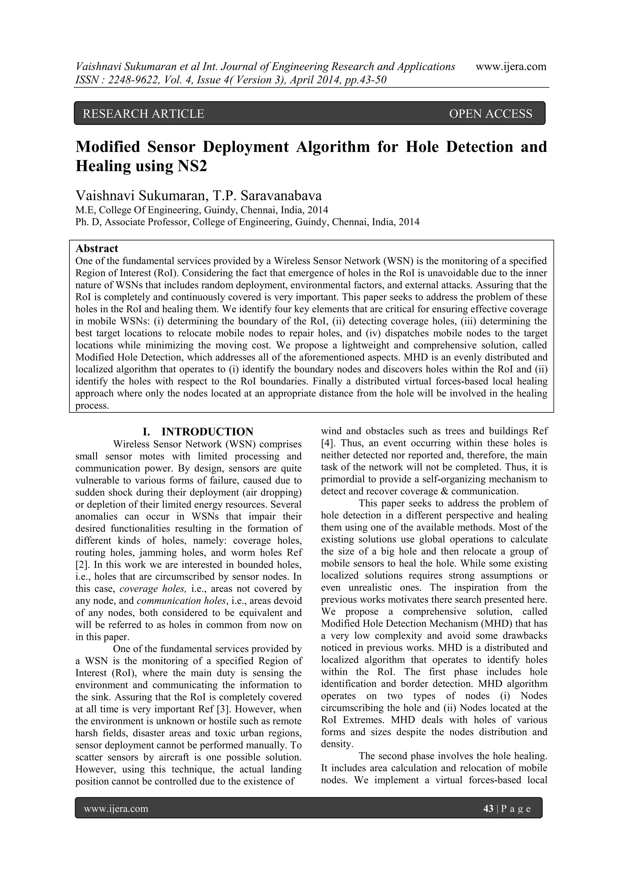 The paper presents a modified hole detection mechanism (MHD) for wireless sensor networks (WSNs) to identify and heal coverage holes effectively. It introduces localized algorithms to detect boundary and coverage holes, and a virtual forces-based approach for healing them, focusing on minimizing movement costs by relocating only the necessary mobile nodes. The solution aims to enhance the reliability of WSNs, particularly in hostile environments where traditional deployment methods are impractical.