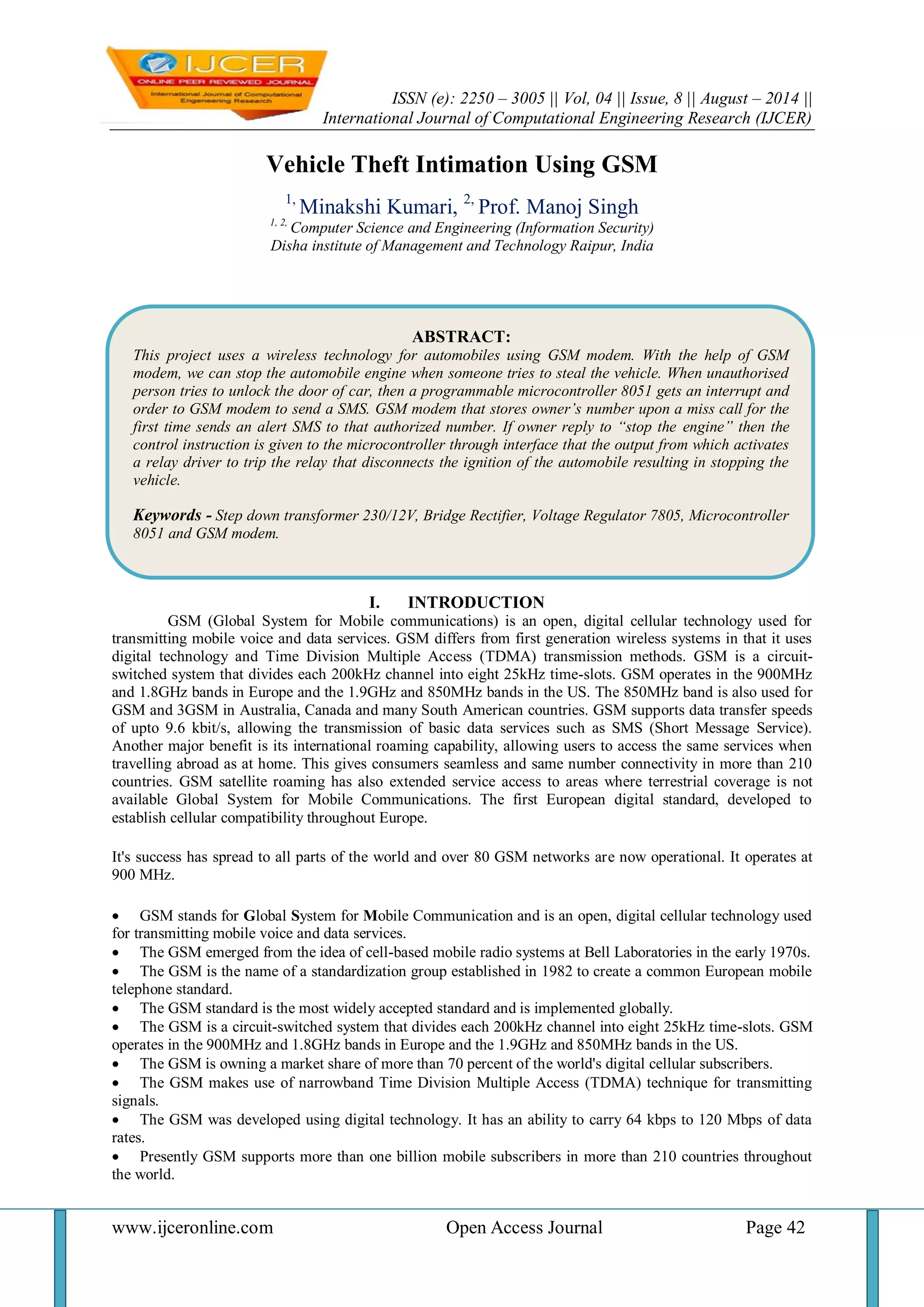 1. The document describes a vehicle theft prevention system that uses a GSM modem. When an unauthorized person tries to unlock the vehicle door, a microcontroller detects the event and orders the GSM modem to send an alert SMS to the owner's phone number.